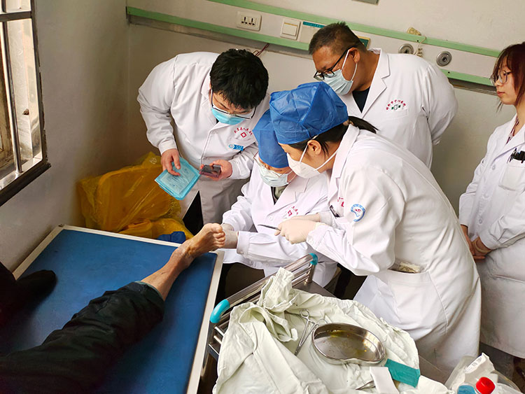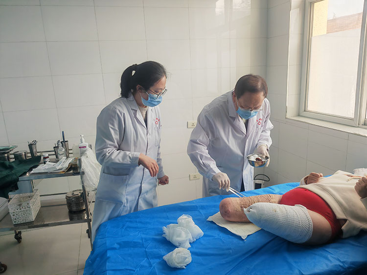 4月9日,應(yīng)大名縣醫(yī)院之邀,《中國燒傷創(chuàng)瘍雜志》常務(wù)編委、燒傷創(chuàng)瘍再生醫(yī)療技術(shù)臨床專家趙瑞慶,在該院骨科病區(qū)、內(nèi)分泌病區(qū),使用再生醫(yī)療技術(shù)連續(xù)會診了七例患者(糖足潰瘍4例、靜脈曲張潰瘍1例、足跟跟腱感染1例、髕骨骨折術(shù)后切口感染)。事后在醫(yī)辦室逐個(gè)病案展開討論點(diǎn)評,并且制定岀詳細(xì)的治療方法,受到當(dāng)?shù)蒯t(yī)護(hù)人員家屬的熱情稱贊。