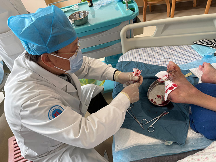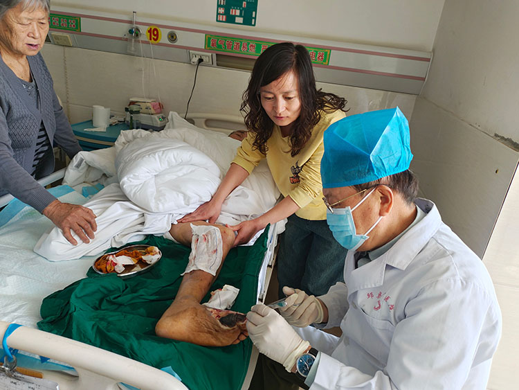 4月10日,《中國燒傷創(chuàng)瘍雜志》常務(wù)編委、燒傷創(chuàng)瘍再生醫(yī)療技術(shù)臨床專家趙瑞慶,應(yīng)邱縣中醫(yī)院急會診邀請,采用再生醫(yī)療技術(shù)會診了糖尿病合并癥患者。該患者四個(gè)月前曾在北京某醫(yī)院就診,未見好轉(zhuǎn),故轉(zhuǎn)回當(dāng)?shù)蒯t(yī)院治療。事后趙教授和當(dāng)?shù)蒯t(yī)護(hù)人員,認(rèn)真討論了發(fā)病的過程,并且制定了具體的治療計(jì)劃,強(qiáng)調(diào)注意觀察各階段的病情變化,嚴(yán)格落實(shí)各階段的治療措施。