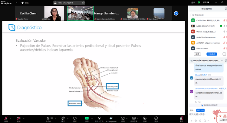 2025年5月9日(秘魯時(shí)間5月8日晚),該系列第三期——糖尿病足專題研討會(huì)順利開(kāi)展。美寶國(guó)際技術(shù)部主任徐巍巍作為本次研討會(huì)的講者,系統(tǒng)性地從糖尿病足的病理生理學(xué)基礎(chǔ)、臨床診斷標(biāo)準(zhǔn)、治療方案優(yōu)化、再生醫(yī)療技術(shù)作用機(jī)制與臨床案例解析等多個(gè)維度,分享了糖尿病足不同階段的診療方法,全面展現(xiàn)了再生醫(yī)療技術(shù)的臨床價(jià)值與獨(dú)特優(yōu)勢(shì)。參會(huì)的醫(yī)生和學(xué)者多達(dá)100余人,來(lái)自秘魯、智利、巴拿馬、厄瓜多爾等拉美國(guó)家。在問(wèn)答環(huán)節(jié)中,根據(jù)與會(huì)者提出的諸多問(wèn)題,如再生醫(yī)療技術(shù)展現(xiàn)顯著療效的最短時(shí)間周期、各類治療方法聯(lián)合應(yīng)用、患者換藥頻次等問(wèn)題,雙方進(jìn)行了熱烈的討論,獲得與會(huì)者一致好評(píng)。