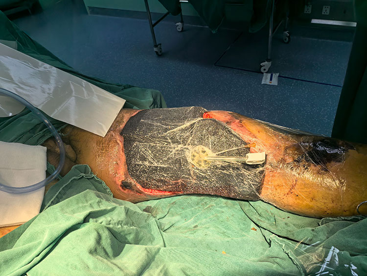 10月10日,應(yīng)長治市人民醫(yī)院急診邀請,《中國燒傷創(chuàng)瘍雜志》常務(wù)編委、燒傷創(chuàng)瘍再生醫(yī)療技術(shù)臨床專家趙瑞慶,會診一例裝載機(jī)碾軋傷工人。次日在全麻下行雙下肢大腿內(nèi)側(cè),外側(cè)壞死組織清創(chuàng)術(shù),事后使用vsd裝置,術(shù)后制定了詳細(xì)的治療方案。
