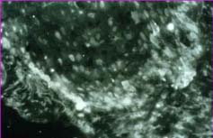用放射性免疫熒光技術(shù),以角蛋白19型陽(yáng)性反應(yīng)的細(xì)胞作為對(duì)標(biāo)定皮下組織細(xì)胞產(chǎn)生增殖及增殖分化的跟蹤表達(dá)細(xì)胞,跟蹤其皮膚器官原位再生復(fù)制過(guò)程中的細(xì)胞變化。跟蹤過(guò)程顯示,在深度燒傷后沒(méi)有使用生命再生物質(zhì)前,燒傷處的活組織及同體局部的未傷皮膚中,未見(jiàn)角蛋白19型陽(yáng)性的細(xì)胞,但在用生命物質(zhì)治療后的24小時(shí)內(nèi),受傷處活組織可見(jiàn)大量的角蛋白19型陽(yáng)性的細(xì)胞,在組織切片中證實(shí),這些細(xì)胞出現(xiàn)在皮下組織中的脂肪隔纖維組織中;治療后第四天開(kāi)始,這些細(xì)胞出現(xiàn)明顯的增殖及分化,已發(fā)展成不同的細(xì)胞,第7天至第14天,角蛋白19型陽(yáng)性的細(xì)胞量達(dá)高峰,而此刻原位皮膚組織的基礎(chǔ)已建立,但組織學(xué)仍分不出組織類(lèi)別,第21天開(kāi)始,角蛋白19型陽(yáng)性細(xì)胞逐漸減少,而皮膚組織基本形成,其中的毛囊器官、汗腺、皮脂神經(jīng)纖維和末端神經(jīng)器官也開(kāi)始形成,大小血管也已建立,在28天內(nèi),實(shí)現(xiàn)了皮膚組織由原始的雛形形成到皮膚器官的全部建立;第28天后,皮膚器官原位再生復(fù)制全部完成,角蛋白19型陽(yáng)性細(xì)胞已不出現(xiàn),說(shuō)明皮膚器官已全部建立,增殖的細(xì)胞已完成使命。用組織染色的方法證實(shí)新復(fù)制的皮膚器官是一個(gè)全新的、由多個(gè)組織器官組成的、具有原來(lái)皮膚器官的全部功能和結(jié)構(gòu)的新的皮膚器官。(詳看全部的跟蹤圖片介紹。圖6.8~6.28)