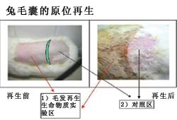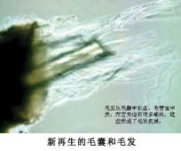 取毛囊再生的生命物質(zhì),外涂于化學(xué)脫毛的白兔背部皮膚,毛發(fā)很快全部再生,而空白對(duì)照組毛發(fā)則很少再生。將毛囊再生物質(zhì),涂于禿頭的受試者,20天后,毛囊重新長(zhǎng)出,毛發(fā)可生長(zhǎng)1-2厘米長(zhǎng)。(詳見(jiàn)毛囊原位再生圖片介紹 圖7.28-7.31)
