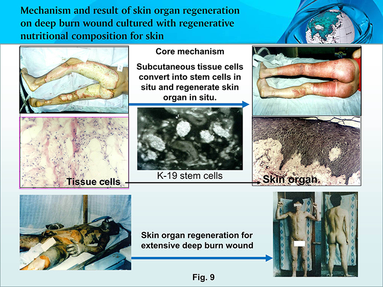 Core mechanism:   For deep burn wounds, under the function of skin regenerative substance, necrotic tissues can be liquefied and removed without further damage; the tissues in burn stasis zone can be restored; and an ecological enclosed environment can be established where the residual viable tissue cells transform in situ into regenerative stem cells. Following the development procedures of stem cells, the regenerative stem cells regenerate in situ skin tissues and organs. The mechanism applies to other types of wounds. Examples for accomplished human application results are attached below (Fig. 9, 10).