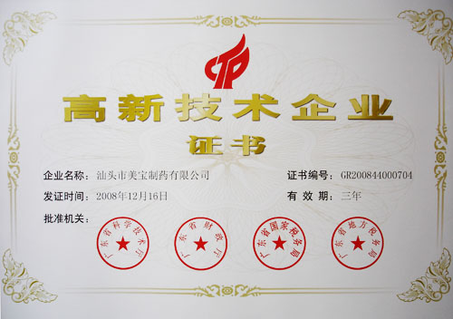 汕頭市美寶制藥有限公司是美寶國際集團在汕頭經(jīng)濟特區(qū)創(chuàng)辦的高科技制藥企業(yè),日前被廣東省科技廳等四家單位共同認(rèn)定為2008年第一批高新技術(shù)企業(yè),并于2008年12月16日頒發(fā)了證書。