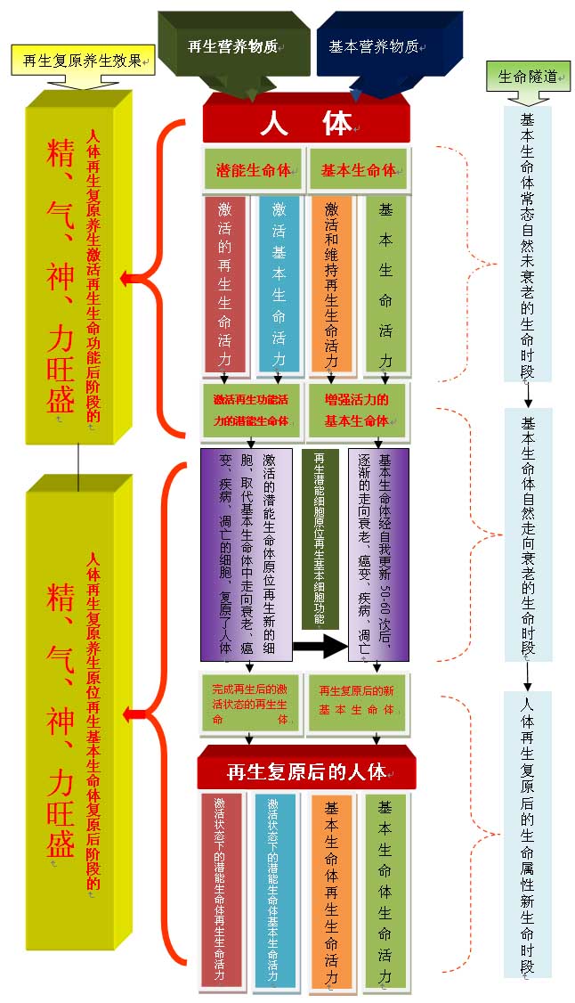 “生命體”、“生命環(huán)境”以及“再生營(yíng)養(yǎng)”是人體再生復(fù)原的技術(shù)實(shí)施前提和基礎(chǔ),結(jié)合運(yùn)用“再生復(fù)原技術(shù)”便可以實(shí)現(xiàn)人體生命的“精、氣、神、力”持續(xù)旺盛。其中,“再生營(yíng)養(yǎng)”是人體再生復(fù)原科學(xué)核心技術(shù)中最重要的組成部分,研究表明,它具備四大功能,第一,啟動(dòng)并喚醒人體“潛能生命體”的生命功能,使其發(fā)揮基本生命體的生命功能,保障和加強(qiáng)人體基本生命功能的力量;第二,激活并啟動(dòng)人體“潛能生命體”的再生基本生命體的程序,即當(dāng)“基本生命體”中的細(xì)胞出現(xiàn)衰老、癌變、凋亡、嚴(yán)重疾病這四大死亡程序時(shí),“潛能生命體”可以原位再生一個(gè)新的基本生命體,替換(或補(bǔ)充)原來器官組織中因四大死亡程序而導(dǎo)致的基本生命體缺如,從而實(shí)現(xiàn)基本生命體的結(jié)構(gòu)完整、生命功能正常;第三、激活“基本生命體”的“再生生命活力”;第四,激活“潛能生命體”的“再生生命活力”。人體再生復(fù)原的核心就是利用“再生營(yíng)養(yǎng)”的這四大功能,在保障人體“基本生命”的同時(shí)實(shí)現(xiàn)了人體的“再生生命”及“再生基本生命體”的功能,“潛能生命體”原位再生復(fù)原組織器官的結(jié)構(gòu)、保障和加強(qiáng)組織器官功能的同時(shí),人體原來未發(fā)揮功能的細(xì)胞都參與到了機(jī)體的一線工作當(dāng)中,兩者共同作用實(shí)現(xiàn)了超越常規(guī)健康的人體整體生命活力旺盛的表達(dá),即“精、氣、神、力”旺盛。