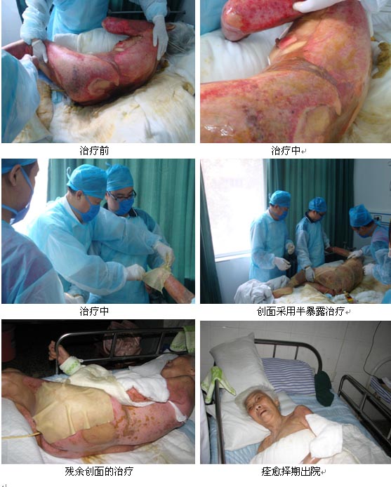 邵陽市人民醫(yī)院是今年剛掛牌成立的中心醫(yī)院,在燒傷科掛牌前該院于201086日收治了1例重度燒傷患者,院領(lǐng)導非常重視?;颊邉⒛常?,88歲。因腰部疼痛行蒸汽治療時不慎跌入開水中,導致背部、雙側(cè)側(cè)胸、左側(cè)乳房、臀部、會陰部,左側(cè)上、下肢及右側(cè)大腿后外側(cè)等燙傷,患者傷后1.5小時入院。入院診斷:特重度燒傷。燒傷面積60% TBSA,III度燒傷面積為15%TBSA;深II度燒傷面積為45% TBSA?;颊呷朐汉?,醫(yī)院立即靜脈置管建立可靠靜脈通路,并將其轉(zhuǎn)入ICU病房后采用抗休克等綜合治療。中國燒傷創(chuàng)瘍科技中心臨床部金黨軍教授在接到該院的電話后,立即從湖北趕往邵陽為患者會診。