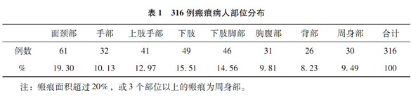316例病人全部為深Ⅱ度以上燒傷病人,其中男性206人,占65.19%,女性110人,占34.81%,3個月內(nèi)的預防性應用154例,占48.73%。預防兼治療性應用162例,占51.17%,按預先設(shè)計的治療方法和療效評定標準評定,全部在右效范圍,右效率100%。治療部位見表1。