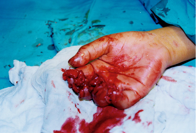 損傷原因:均為魚(yú)粉廠工人用粉碎機(jī)粉碎魚(yú)粉過(guò)程中不慎手指進(jìn)入而引起手指粉碎、絞傷。共損傷手指23指其中拇指3例、食指6例、中指6例、無(wú)名指4例、小指4例,損傷程度:損傷手指中末節(jié)不同程度完全粉碎缺失或近似完全缺失。手指掌指關(guān)節(jié)及中節(jié)皮膚肌腱、血管、神經(jīng)均不同程度絞傷、撕脫呈條索狀、3指掌指關(guān)節(jié)近端有撕脫骨折。接診時(shí)間均在傷后3小時(shí)入