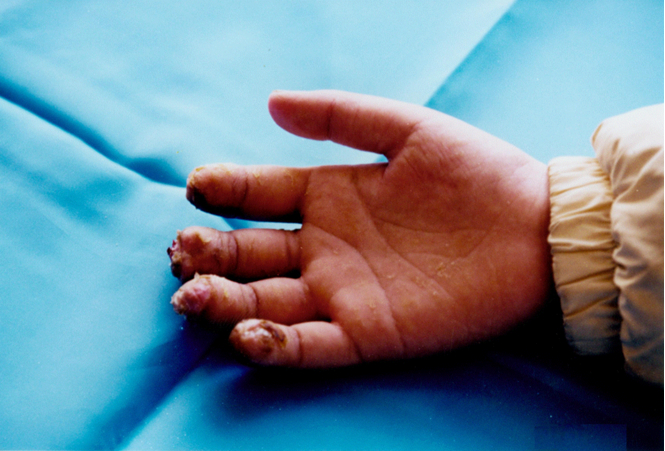 患者,劉xx,女,26歲,工人,重慶人,因粉碎魚(yú)粉過(guò)程中,右手不慎進(jìn)入機(jī)器內(nèi),至右手粉碎傷1.5小時(shí),急診入院于2008年7月,住院號(hào)383586。入院查體:右手示、中、環(huán)、小指中末節(jié)不同程度缺失,組織損毀嚴(yán)重。該患者損傷嚴(yán)重,入院后及時(shí)給與心理疏導(dǎo),幫助建立康復(fù)信心,采用保留清創(chuàng)后,手指損傷局部應(yīng)用MEBT/MEBO創(chuàng)面治療,術(shù)后創(chuàng)面應(yīng)用紅外線照射,病人住院15天后康復(fù)出院,出院后繼續(xù)外涂MEBT/MEBO治療,半年后隨訪,損傷的手指局部組織再生,恢復(fù)一定長(zhǎng)度,痛溫覺(jué)及相應(yīng)功能健在。