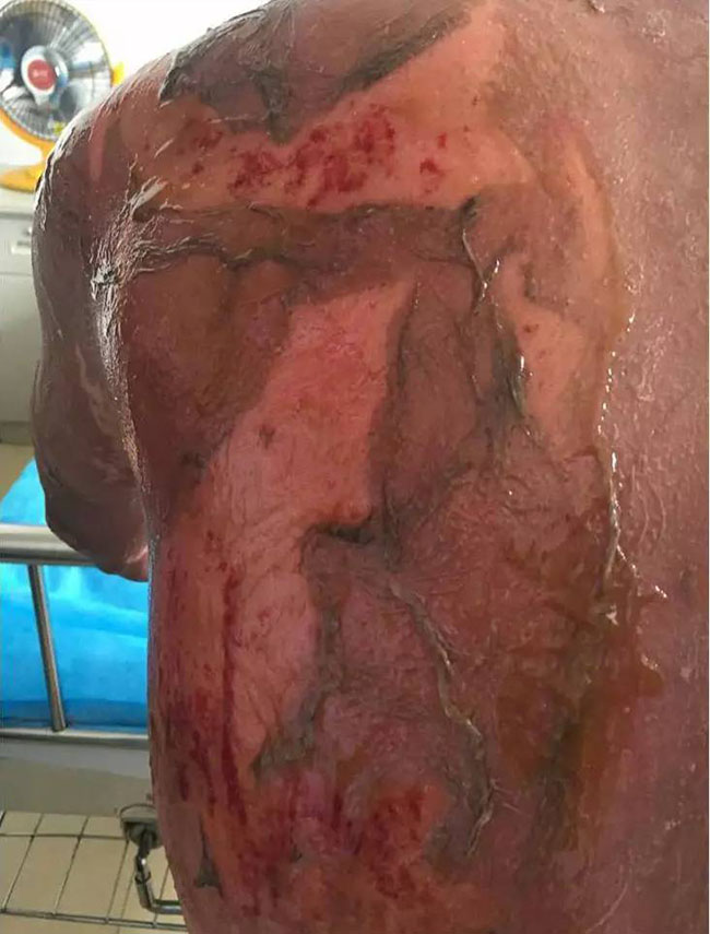 皰皮開始脫落,可見粉色的上皮爬行,患者主訴之前出現(xiàn)的瘙癢、疼痛等不適感幾乎消失,患者狀態(tài)較好。皮膚大部分顏色恢復(fù)至正常顏色,繼續(xù)應(yīng)用美寶濕潤燒傷膏。