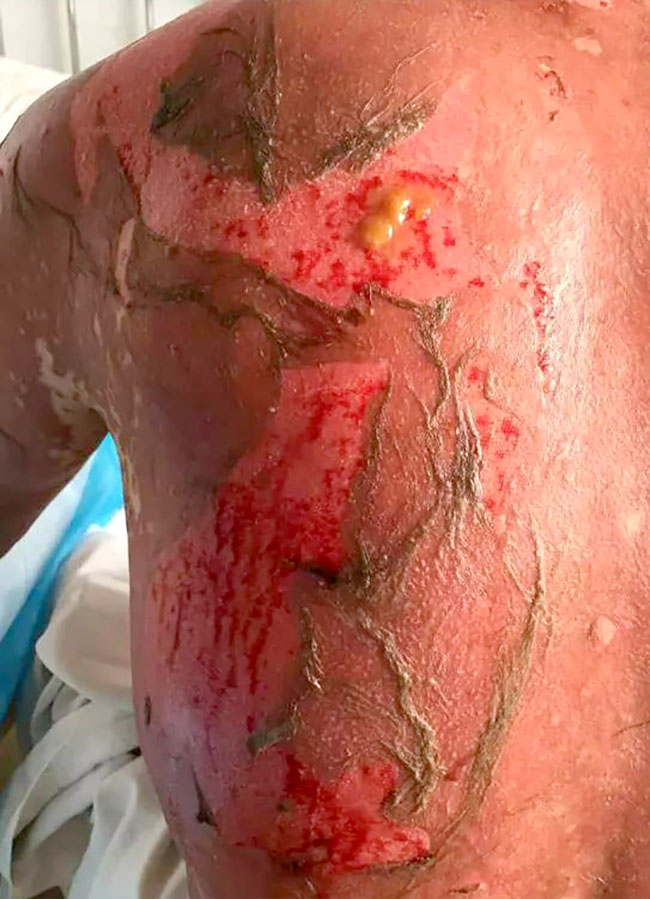 創(chuàng)面可見新生的粉紅色上皮組織,患者全身大部分皮膚恢復(fù)情況較好。