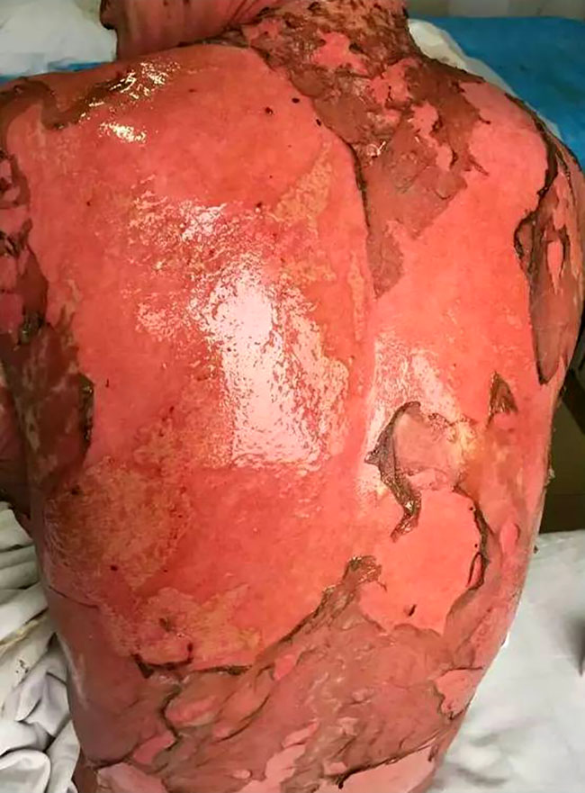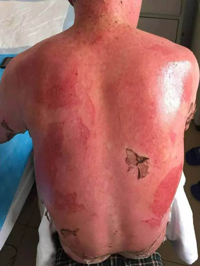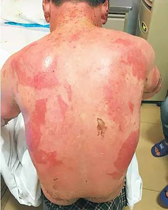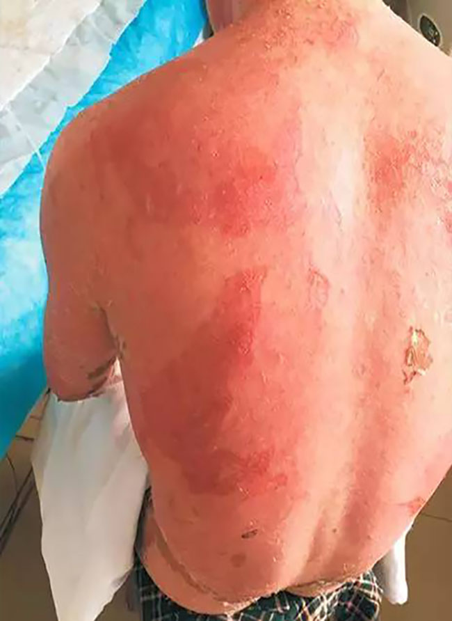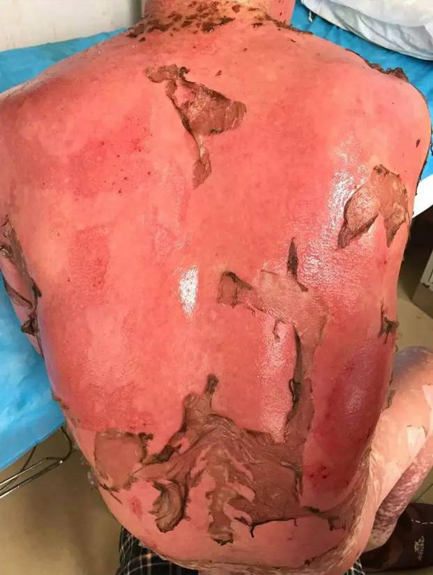 這張照片看起來觸目驚心,這就是一個藥物嚴(yán)重過敏的男性患者,年齡38歲。于2016年 8月26起口服卡馬西平抗癲癇治療,服藥后出現(xiàn)頭皮瘙癢,未重視;9月5日患者出現(xiàn)周身皮膚瘙癢,皮膚發(fā)紅,未進(jìn)行治療,期間繼續(xù)服用卡馬西平;9月6日,上述癥狀加重,發(fā)紅處出現(xiàn)水皰;9月8日19:30患者入院治療。以“藥物過敏致全身大面積剝脫性皮炎”收入重癥監(jiān)護(hù)室,該患者皮疹多種形態(tài),可見斑疹、斑丘疹、斑片,自覺瘙癢,可見水皰及皮膚破潰,口腔黏膜破潰。最初他只是以為是蕁麻疹卻未想到,是他治療癲癇的口服藥造成的藥物性過敏,而且來勢洶洶。