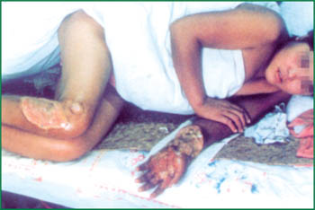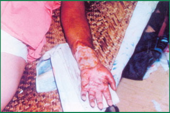 1、 該病例為電擊傷,手腕、前臂部位嚴重損傷。手腕前肌肉群全部壞死,尺橈動脈壞死,骨間動脈尚存活,上肢壓疼點至肘部。