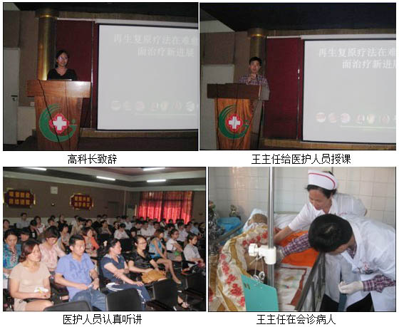 2012年4月13日上午,應(yīng)廣東省農(nóng)墾中心醫(yī)院之邀,中國中西醫(yī)結(jié)合學會燒傷專業(yè)委員會常委兼秘書、《中國燒傷創(chuàng)瘍雜志》副總編輯、北京美寶燒傷創(chuàng)瘍研究所副所長、第二臨床研究部主任王洪生研究員到醫(yī)院做“再生復(fù)原療法在深度燒傷及難愈性創(chuàng)面治療新進展”專題學術(shù)講座。廣東省農(nóng)墾中心醫(yī)院全院的醫(yī)護人員均參加了此次培訓,在學術(shù)講座中,王主任首先向與會的專家介紹了著名生命科學家、醫(yī)學家、人體再生復(fù)原科學的創(chuàng)立者、再生復(fù)原療法的發(fā)明人徐榮祥教授近年來在再生醫(yī)學領(lǐng)域所取得的重大實驗及臨床研究成果,而后王主任結(jié)合了大量的臨床病例圖片及錄像資料,主要針對深度燒傷及各類難愈性創(chuàng)傷、潰瘍創(chuàng)面的規(guī)范化處理方法與技巧、注意事項等進行了細致地講解,在座的各位醫(yī)護均被這神奇的療法折服。會后,醫(yī)護人員向王主任詢問了臨床上所遇到的問題,王主任一一作了詳細解答。該醫(yī)院醫(yī)務(wù)科高科長作總結(jié)發(fā)言時,高度贊揚了再生復(fù)原療法,稱之為一種為患者帶來福音的一種療法。隨后,應(yīng)高科長和老年科護長的邀請,王主任親自到老年科對一名深度褥瘡患者進行了會診,并提出治療建議。