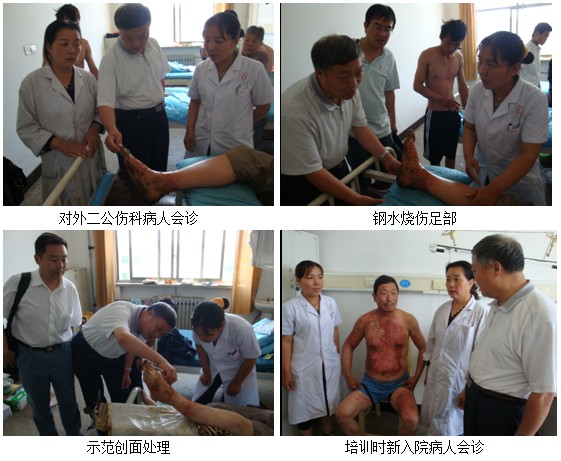 2009年6月9日中國(guó)中西醫(yī)結(jié)合學(xué)會(huì)燒傷專(zhuān)業(yè)委員會(huì)常委、北京美寶燒傷創(chuàng)瘍研究所臨床部研究員、燒傷創(chuàng)瘍專(zhuān)家金黨軍主任和山西省辦事處董在新、張堯同志一起走訪了太谷縣中醫(yī)院,和外科曹新亮主任進(jìn)行了再生復(fù)原醫(yī)療技術(shù)的臨床應(yīng)用交流。早上九點(diǎn)我們?cè)谕饪撇苤魅蔚膸ьI(lǐng)下會(huì)診了醫(yī)院的6位燒傷病人、六位都是鐵水燒傷,面積小,屬于重度燒傷,在會(huì)診完這六位病人后,金教授結(jié)合住院病人的創(chuàng)面處理情況、給全科醫(yī)人員講了燒傷再生復(fù)原醫(yī)療技術(shù)臨床規(guī)范應(yīng)用培訓(xùn)課。