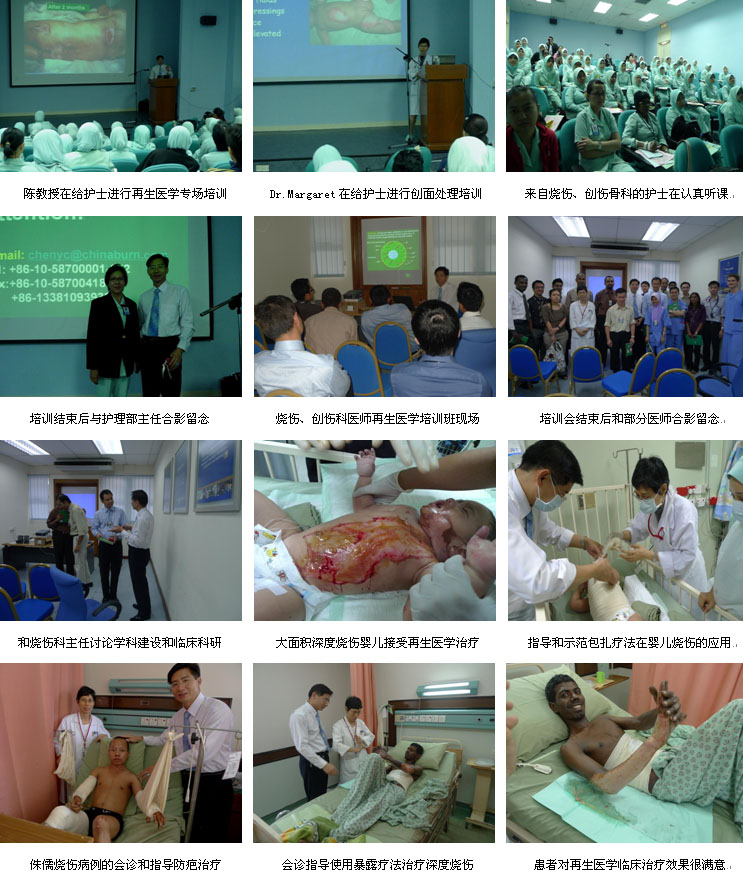 醫(yī)院,800多病床)的燒傷中心建設(shè)、醫(yī)護人員培訓、臨床病例的會診救治、媒體宣傳的組織策劃等工作均收效顯著。這次對重點醫(yī)院的技術(shù)支持和幫助,主要是針對新成立燒傷中心后的進一步規(guī)范燒傷再生醫(yī)學技術(shù)在該中心的應(yīng)用而安排的,中國燒傷創(chuàng)瘍科技中心臨床部主任、北京榮祥再生醫(yī)學研究所副所長陳永翀教授承擔了這次技術(shù)支持任務(wù),同時燒傷中心主任Dr. Salina 結(jié)合自己的經(jīng)驗和陳教授積極配合,對全科的16名醫(yī)護人員進行了較系統(tǒng)和全面的燒傷、創(chuàng)瘍和疤痕治療的再生醫(yī)學技術(shù)培訓、病例討論、會診指導和現(xiàn)場示范等。期間,陳教授還約見了醫(yī)院的院長Dr. Khalid Ibrahim,介紹了徐榮祥教授發(fā)明創(chuàng)立的燒傷再生醫(yī)學技術(shù)的特點與臨床應(yīng)用的真實效果,以及陳教授在中國和部分國外的國家,利用燒傷再生醫(yī)學的技術(shù)優(yōu)勢,幫助多家醫(yī)院成功建設(shè)發(fā)展燒傷中心的經(jīng)驗,與院長就下階段燒傷中心的建設(shè)與發(fā)展問題進行了深入的研究和討論,確定了燒傷中心未來的發(fā)展方向和目標。院長表示一定將國際領(lǐng)先的燒傷再生醫(yī)學技術(shù)作為燒傷中心發(fā)展的根本,全面支持燒傷中心的建設(shè)與發(fā)展。