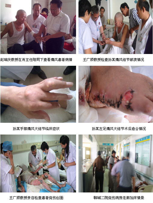 在今年下半年以來,趙瑞慶教授、王廣順教授先后2次來到該醫(yī)院進(jìn)行技術(shù)指導(dǎo)工作,該院領(lǐng)導(dǎo)對(duì)兩位專家的走訪高度重視,侯慶民副院長、肖繼洲主任接待了兩位專家,趙瑞慶教授、王廣順教授在聽取了再生醫(yī)療技術(shù)在該院開展、推廣的工作匯報(bào)后,特意來到該院的燒傷病房進(jìn)行醫(yī)療查房,當(dāng)看到該院采用燒傷創(chuàng)瘍?cè)偕t(yī)療技術(shù)成功救治的患者后,兩位專家十分欣慰。在兩位主任走到一位痛風(fēng)患者病床前時(shí),患者表示他患痛風(fēng)好多年了,到山東省各大醫(yī)院去過很多次,痛風(fēng)結(jié)節(jié)的破潰傷口都無法治愈,來到該院后是肖主任用再生技術(shù)治愈了他多年不愈的傷口,目前該患就要出院了,他對(duì)二院燒傷科的醫(yī)生、護(hù)士再次表示了感謝。查房結(jié)束后,趙瑞慶教授與肖主任認(rèn)真總結(jié)了全身痛風(fēng)這一罕見病例,并將各個(gè)治療階段的資料做好總結(jié)。