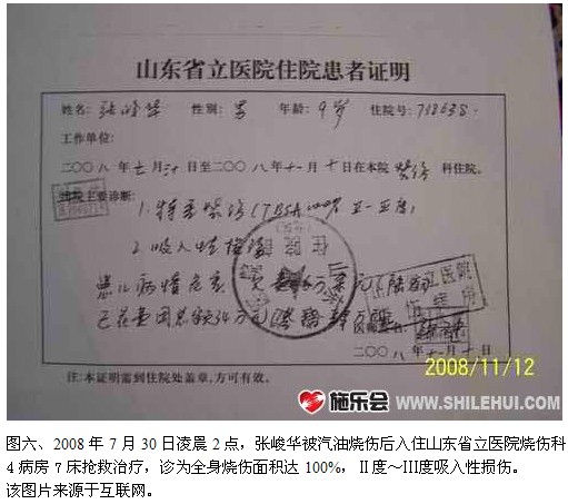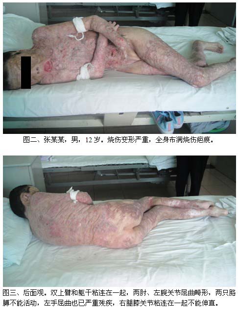 張某某于三年前的一天(2008年7月30日)凌晨2點,同睡的媽媽聽到燃燒的爆裂聲醒來,發(fā)現(xiàn)身邊的孩子竟被焚燒,滅火后即被送到山東省立醫(yī)院燒傷科搶救治療,經(jīng)過醫(yī)生檢查確診為全身燒傷面積達(dá)100%,Ⅱ度~Ⅲ度;吸入性損傷而住院近三年。歷經(jīng)大型植皮手術(shù)十六次和多次換藥疼痛出血的折磨,現(xiàn)在皮膚已基本植全卻不能再生長了,孩子雖頑強(qiáng)的生存了下來,但疤痕累累,嚴(yán)重殘疾并喪失了正常的生活能力。一般認(rèn)為,12歲的張某某隨著年齡變大,發(fā)育的骨骼與緊縮的皮膚之間會越來越?jīng)_突。必須隔一段時間在骨骼生長的地方把皮膚切開再植皮,如此持續(xù)到張某某不再長身體為止。由于缺乏正常皮膚,疤痕修復(fù)困難。