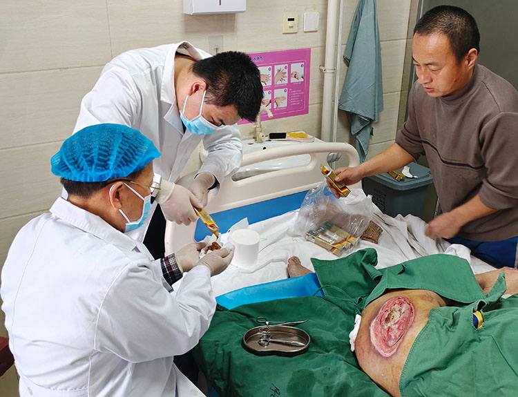 2月25日,受永興縣中醫(yī)醫(yī)院外二科何利軍主任的邀請,《中國燒傷創(chuàng)瘍雜志》編委、燒傷創(chuàng)瘍再生醫(yī)療技術(shù)臨床專家金黨軍,到科室參加科室查房、會診多名創(chuàng)瘍患者,為醫(yī)護(hù)人員培訓(xùn)并進(jìn)行了交流,之后親自示范再生醫(yī)療技術(shù)換藥流程。金主任還與骨科,內(nèi)分泌科主任們一起探討后期永興縣創(chuàng)面修復(fù)與再生醫(yī)療聯(lián)盟建設(shè)和聯(lián)盟技術(shù)指導(dǎo)單位的醫(yī)護(hù)人員學(xué)習(xí)培訓(xùn),旨在將再生醫(yī)療技術(shù)在永興縣基層醫(yī)療單位逐步普及和應(yīng)用,為廣大燒傷創(chuàng)瘍患者帶來福音。