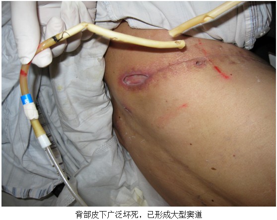 患者李石頭,男,81歲,陜西大同人。因背部腫瘤手術切術后化療,傷口久經不愈,近幾天連續(xù)發(fā)熱39—41℃,由外院轉來就醫(yī),右側背部及肋下第8根肋骨處為入口到背部脊骨,中間開放性創(chuàng)口10cm*15cm,呈膿性分泌物。