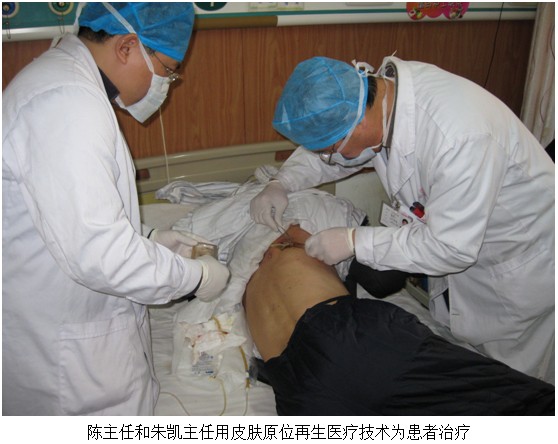 朱凱主任說:“原來只知道MEBO治療燒傷,不知道還有其他用途?!标愔魅谓o病人做了清創(chuàng)術,并用人體皮膚原位再生醫(yī)療技術治療(見圖片)。兩天后,病人不再發(fā)燒,體溫由40℃降至37℃。目前用人體皮膚原位再生醫(yī)療技術繼續(xù)治療中,詳細請看下期報道。