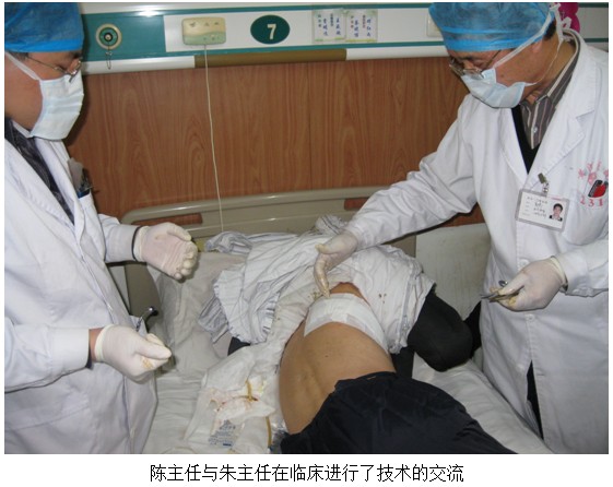 2013年元月15日,三門峽市黃河醫(yī)院外科朱凱主任邀請中國中西醫(yī)結合學會燒傷專業(yè)委員會委員、北京美寶燒傷創(chuàng)瘍研究所臨床部主任陳全喜來到黃河醫(yī)院外科會診右側背部肋下廣泛肌肉壞死(已在外省治療9個月,因連續(xù)發(fā)熱不退,轉黃河醫(yī)院外科)的高齡危癥病人。