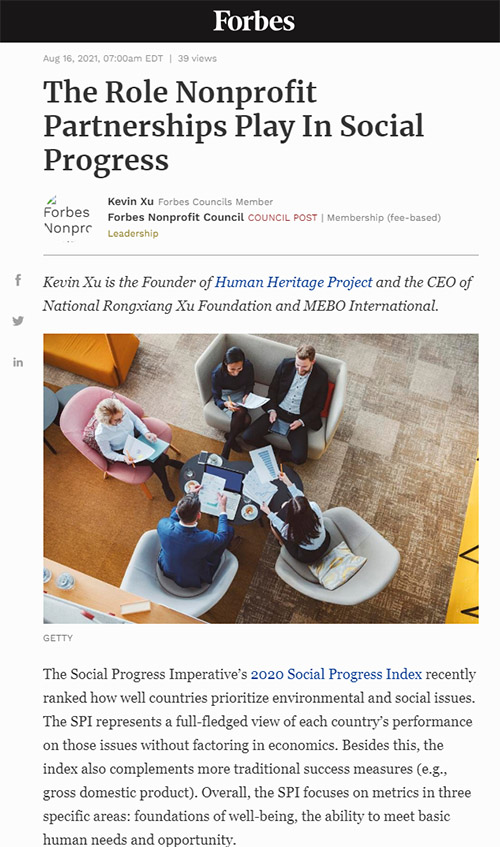 2021年8月16日,美寶集團(tuán)34周年紀(jì)念日,《福布斯》特別刊發(fā)美寶集團(tuán)董事局徐鵬文章——非營(yíng)利伙伴關(guān)系在社會(huì)進(jìn)步中的作用。徐鵬希望通過非營(yíng)利組織,提高國(guó)家的社會(huì)進(jìn)步指數(shù)(SPI)。