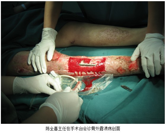 患者王雙,男,43歲。因機械事故造成右腿脛骨中段粉碎性骨折。用鋼板固定住院治療70天,傷口不愈合。陳全喜主任會診后認為傷口不愈合有3個因素:局部組織已纖維化,創(chuàng)面得不到營養(yǎng)、細胞不分裂增殖③創(chuàng)面得不到一個良好的濕潤環(huán)境,所以局部組織細胞不增殖分化,傷口不愈合,羅主任及大夫們認真汲取了建議。