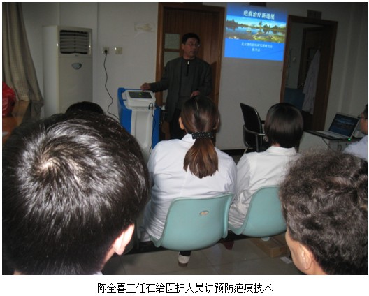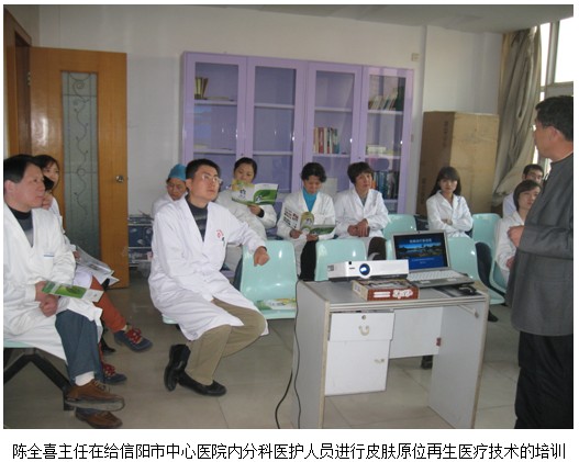 2012年11月18日,中國(guó)中西醫(yī)結(jié)合學(xué)會(huì)燒傷專(zhuān)業(yè)委員會(huì)委員、北京美寶燒傷創(chuàng)瘍研究所臨床部專(zhuān)家陳全喜主任受信陽(yáng)市中心醫(yī)院內(nèi)分泌科主任郭向陽(yáng)的邀請(qǐng)和區(qū)域經(jīng)理李瑩瑩一同到信陽(yáng)市中心醫(yī)院內(nèi)分泌科進(jìn)行全科人員的皮膚原位再生醫(yī)療技術(shù)的培訓(xùn)。