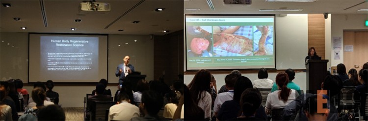 8月16日中午,ISRMWR在新加坡中央醫(yī)院Academia學(xué)術(shù)報告廳White Space分會場再一次舉辦了再生醫(yī)學(xué)專場。本次專場,特別邀請到中山大學(xué)附屬第一醫(yī)院燒傷外科劉旭盛主任作為會議主持,分別有來自中國、印尼和馬來西亞的4位再生醫(yī)學(xué)專家?guī)砹司恃葜v。來自印尼雅加達 Rawamangun醫(yī)院的Donna Savitry醫(yī)生,她是印尼整形外科學(xué)會副秘書長,已有近10年的再生醫(yī)療經(jīng)驗。她帶來的題目是“Strategy to Use MEBO Effectively in Low Budget Burn Patient: An Observation in Daily Practice“。在演講中,她分享了其多年的治療經(jīng)驗和多個精彩病例,量化藥量使用評估讓人耳目一新。韶關(guān)市第一人民醫(yī)院燒傷科的陳錚主任,他的演講題目是“Treating Generalized Skin Diseases with MEBO”。他分享了數(shù)例藥物導(dǎo)致大皰表皮松解癥的嚴(yán)重病例,患者病情之嚴(yán)重,治療效果之顯著,令與會者贊嘆不已。來自馬來西亞東海岸線的Mohd Zurairie醫(yī)生,今年5月到中國長沙開展過學(xué)術(shù)交流,他的演講題為“Exudates Management and Cell Regenerative in Chronic Wound Lessening Healing Time”。Zurairie醫(yī)生應(yīng)用再生醫(yī)療技術(shù)時間不長,在演講上,他和與會者客觀地分享了他的學(xué)習(xí)和探索體會。北京南苑醫(yī)院燒傷創(chuàng)瘍中心的陳永翀主任分享的內(nèi)容為“The New Application of Burns Regenerative Medicine Therapy in Malignant Ulcers Treatment”。在演講中,他展示了再生醫(yī)療技術(shù)在治療惡性潰瘍中的卓越效果,并呼吁與會專家共同研究探索燒傷再生醫(yī)療技術(shù)在這一領(lǐng)域的更深層次應(yīng)用可行性。