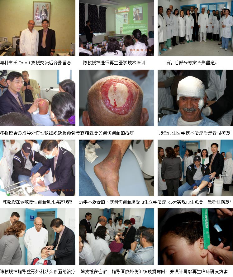 應突尼斯整形燒傷外科學會和多家醫(yī)院的邀請,中國燒傷創(chuàng)瘍科技中心臨床部主任、北京榮祥再生醫(yī)學研究所副所長、北京中西醫(yī)結合學會燒傷專業(yè)委員會副主任委員、中國燒傷創(chuàng)瘍雜志社副社長陳永翀教授于2010年4月26日至30日來到了地處非洲北部的突尼斯,參加了全國燒傷整形學術年會并到多家醫(yī)院進行培訓演講、學術交流、到燒傷中心示范指導燒傷創(chuàng)瘍病例的治療等,很受當?shù)氐尼t(yī)師、護士和患者的歡迎。在短短的4天的時間里,成功參加了國家級學術交流會議并做主題演講,來自全國的燒傷、整形和創(chuàng)傷外科專家35人出席了會議,收到較好的學術推廣、規(guī)范臨床技術的效果;成功舉辦市級培訓班1期,培訓醫(yī)護人員50余名;舉辦院內(nèi)培訓班2期,培訓醫(yī)護人員40余名;培訓經(jīng)銷商的醫(yī)療開發(fā)人員6名;會診、指導2例燒傷患者的治療和5名創(chuàng)瘍患者的治療。實現(xiàn)了較好的開發(fā)效果,現(xiàn)以圖片的方式做一個簡報。