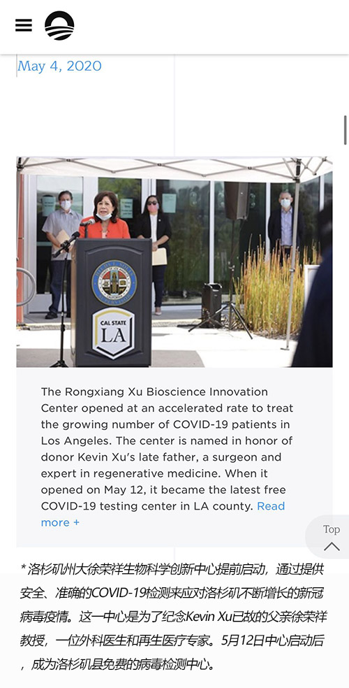 新冠肺炎疫情期間,洛杉磯州大徐榮祥生物科學(xué)創(chuàng)新中心設(shè)立為了新冠肺炎免費(fèi)檢測(cè)點(diǎn)。奧巴馬基金會(huì)將這一充滿溫情的信息與系列或感人或激勵(lì)的暖心小故事一起登于官網(wǎng),在艱難時(shí)刻傳遞希望與愛。