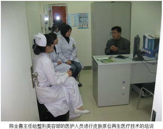 2012年11月5日,中國中西醫(yī)結(jié)合學(xué)會燒傷專業(yè)委員會委員、北京美寶燒傷研究所臨床部專家陳全喜主任應(yīng)邀來到鄭州大學(xué)第二附屬醫(yī)院醫(yī)學(xué)整形美容科,對醫(yī)學(xué)整形美容科的醫(yī)護(hù)人員進(jìn)行皮膚原位再生醫(yī)療技術(shù)的專業(yè)培訓(xùn)。
