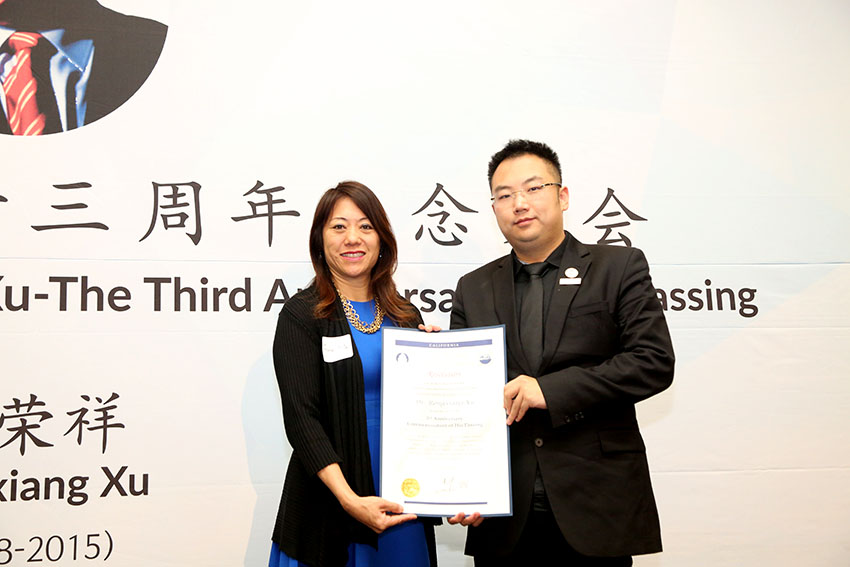 加州平稅局委員馬世云女士希望用徐大夫的科學(xué)技術(shù)提高更多人的生命質(zhì)量,并將他的研究方法發(fā)揚(yáng)光大,讓這個(gè)世界因他而變得更美好。馬世云為徐鵬頒發(fā)了徐大夫逝世三周年紀(jì)念證書(shū),以表感念。