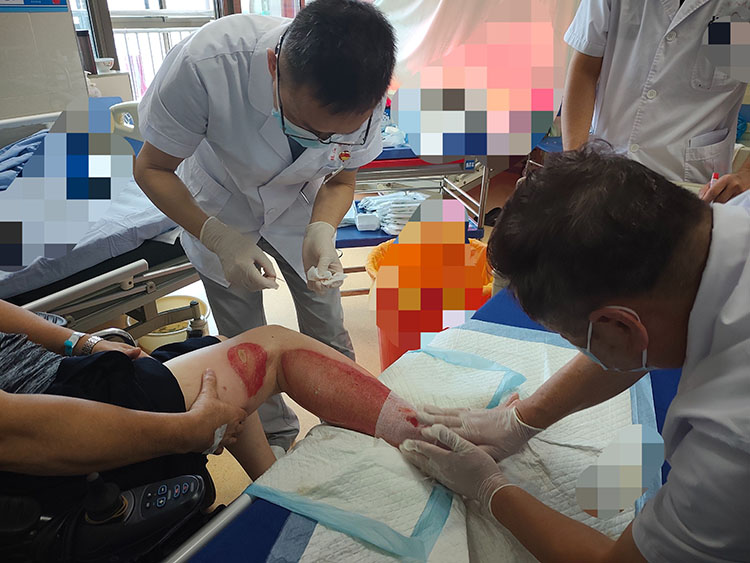 7月12日,應(yīng)山西國藥同煤二醫(yī)院邀請,《中國燒傷創(chuàng)瘍雜志》常務(wù)編委、燒傷創(chuàng)瘍再生醫(yī)療技術(shù)臨床專家趙瑞慶在該醫(yī)院對收治的19例慢創(chuàng)患者進(jìn)行逐一查房檢查,針對其中8例患者親自示范處置演示,在院期間還為一名截癱礦工行骶尾部壓瘡皮簇種植術(shù)。