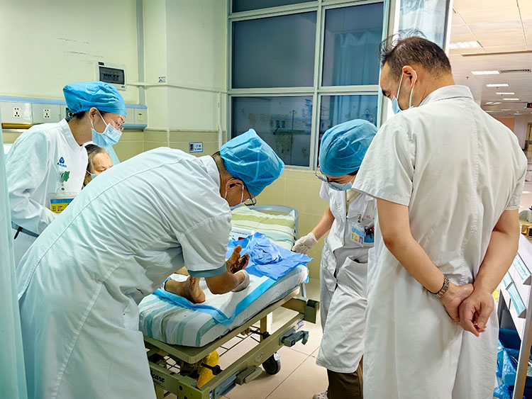2025年7月12日,中國中西醫(yī)結(jié)合學(xué)會燒傷專業(yè)委員會常務(wù)委員、《中國燒傷創(chuàng)瘍雜志》副總編輯王洪生,受邀到漳州市龍海區(qū)榜山衛(wèi)生院會診一例糖尿病足患者,王教授現(xiàn)場教學(xué),親自示范清創(chuàng)和換藥,得到了醫(yī)護(hù)人員和患者家屬的一致好評!