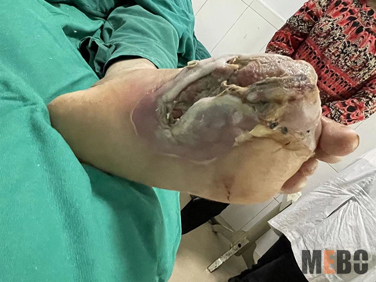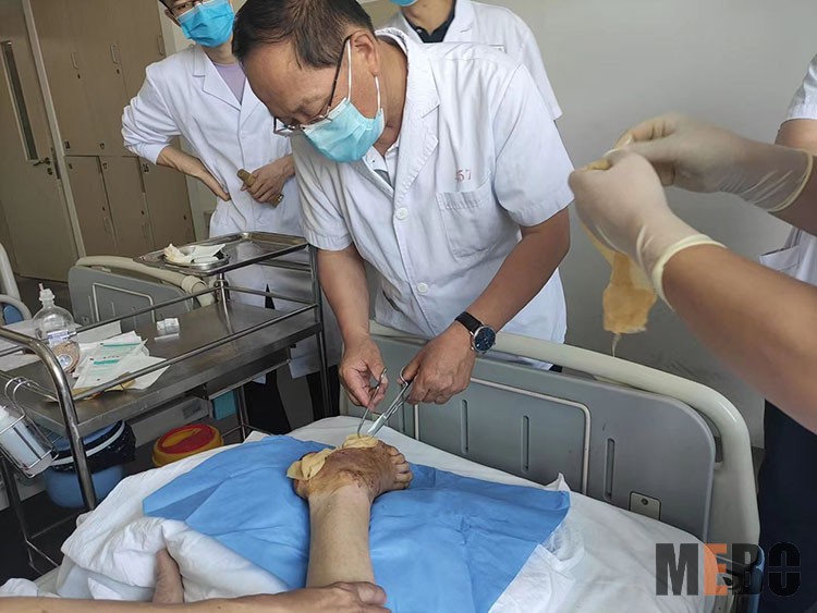 2022年6月23日,應南通市第四人民醫(yī)院之邀,再生醫(yī)學知名專家、《中國燒傷創(chuàng)瘍雜志》常務編委趙瑞慶主任在該院會診了1例老年女性患者,患者有十年糖尿病史,左足感染2月余,外院治療加重合并創(chuàng)面深部感染,趙主任現場進行了引流、清理壞死組織、加用電介質、美寶紗布填塞等規(guī)范操作,還制定了治療計劃,受到當地醫(yī)務人員的稱贊!