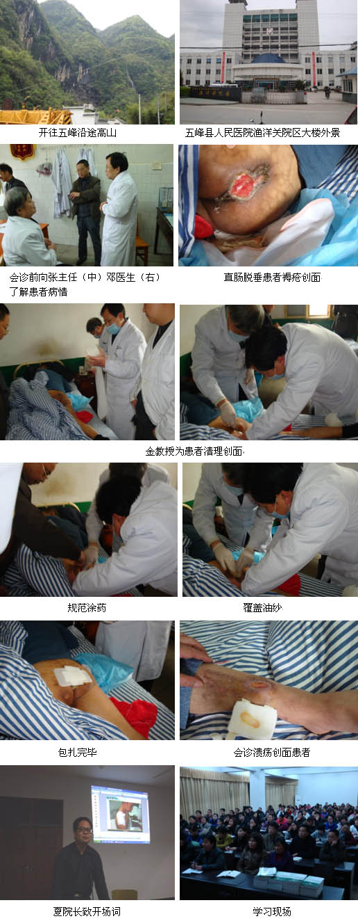 五峰土家族自治縣位于鄂西南邊陲,距宜昌市200公里,無高等級公路,山大人稀。一路蜿蜒顛簸,金黨軍教授歷經了三個半小時車程到達漁洋關鎮(zhèn)。得知金教授來院授課,醫(yī)院夏院長、醫(yī)務科李科長和外科張主任熱情地接待了金教授,雙方就醫(yī)院目前發(fā)展的情況及再生醫(yī)學近期所取得的成就做了簡單地交流。該院外科為骨科、普外科等,該科于今年二月初引進新一代功能復合輔料創(chuàng)瘍貼,取得了不錯的臨床療效。2002年8月五峰縣漁洋關鎮(zhèn)唐黃坪煤礦發(fā)生重大瓦斯爆炸事故,八人遇難,第九人是由該院張主任應用的濕性醫(yī)療技術和美寶濕潤燒傷膏將患者治愈,因此,再生醫(yī)療技術的神奇療效該院領導并不陌生??紤]到醫(yī)護人員的工作時間,夏院長和李科長將學術講座的時間定在晚上七點到九點。下午四點,張主任陪同金教授到該院的住院病區(qū)進行患者會診,其中一位為直腸脫垂、骶尾處褥瘡的老年患者,另一位患者為下肢潰瘍創(chuàng)面,創(chuàng)面較深。金教授分別為兩位患者清理創(chuàng)面后,進行換藥,并制作油紗敷貼包扎,為醫(yī)務人員進行換藥示范。