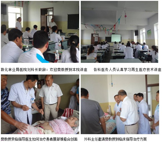 會(huì)議結(jié)束后,應(yīng)普外科張主任邀請(qǐng),樊兆宗教授來到病房會(huì)診了兩例患者:一例褥瘡病人,另一例為腹部難愈合創(chuàng)面,產(chǎn)生竇道,樊教授結(jié)合病人情況再次講解了如何運(yùn)用再生醫(yī)療技術(shù)來進(jìn)行規(guī)范治療。本次學(xué)術(shù)活動(dòng)對(duì)再生醫(yī)療技術(shù)在敦化林業(yè)局職工醫(yī)院的推廣工作打下了堅(jiān)實(shí)的基礎(chǔ)。