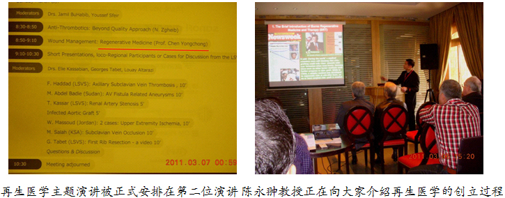 2011年3月6日上午8時(shí)30份,進(jìn)行了簡短的開幕儀式后,便進(jìn)入到主題演講階段。參加這次黎巴嫩血管外科大會的有來自黎巴嫩、敘利亞、蘇丹、伊拉克的血管外科專家60多名,這些都是各國、各醫(yī)院的血管外科主任、學(xué)科帶頭人和資深的專家。再生醫(yī)學(xué)演講被安排在大會第二位發(fā)言,由黎巴嫩血管外科學(xué)會主席、美國大學(xué)貝魯特醫(yī)院血管外科主任Dr. Fady Baddad教授主持,陳永翀代表徐榮祥教授以“The Clinical Application Effect of Burns Regenerative Medicine in Treating Refractory Wounds”(燒傷再生醫(yī)學(xué)治療難愈合創(chuàng)面的臨床應(yīng)用效果)”為題做了精彩的演講,演講內(nèi)容包括:1、徐榮祥教授與燒傷再生醫(yī)學(xué)的創(chuàng)立及臨床治療大面積燒傷的情況簡介;2、難愈合創(chuàng)面的定義與分類;3、再生醫(yī)學(xué)在難愈合創(chuàng)面的臨床治療效果與典型病例;4、再生醫(yī)學(xué)的創(chuàng)面治療原則與換藥規(guī)范。陳教授以通俗、簡練、易懂的語言向參會的專家們講解了燒傷再生醫(yī)學(xué)的發(fā)明與實(shí)現(xiàn)燒傷創(chuàng)面的再生愈合機(jī)理,以圖文并茂的方式向大家展示了臨床治療效果,以嚴(yán)謹(jǐn)、認(rèn)真的態(tài)度地向大家闡述了再生醫(yī)學(xué)的創(chuàng)面治療原則與換藥規(guī)范要求。再生醫(yī)學(xué)的演講深深吸引了大家的注意力,每位專家都聽得非常認(rèn)真,討論階段大家更是踴躍萬分,會場氣氛非常熱烈,而陳教授帶來的《臨床手冊》、《中國燒傷創(chuàng)瘍雜志》、《創(chuàng)面治療規(guī)范》等再生醫(yī)學(xué)資料則被大家蜂擁而上“搶奪”一空,會場情況幾乎到了“失控”的狀態(tài),好在主持人巧妙地引導(dǎo)大家和建議大家在中午午飯時(shí)間還可以向陳教授咨詢,才使會議得以繼續(xù)進(jìn)行下去??梢姶蠹覍υ偕t(yī)學(xué)的興趣和學(xué)習(xí)的熱情是非同一般,演講很受歡迎、反響非凡。