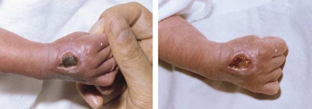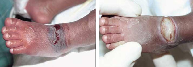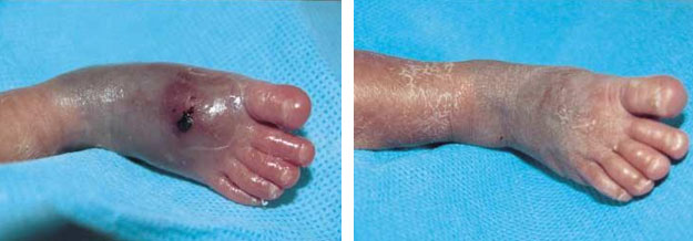患兒胎齡29+6w,出生42d后,輸注濃度為12.5%的全胃腸外營養(yǎng)溶液時發(fā)生滲漏,患兒左足足背處出現(xiàn)水腫和組織壞死表現(xiàn),呈淡藍色并伴有淡紅色水泡。發(fā)現(xiàn)水腫后,立即采取人體再生技術(shù)處理創(chuàng)面,同時抬高左足。然后靜脈注射抗菌藥(第一代頭孢菌素)與維生素C的混合液。兩周后,創(chuàng)面出現(xiàn)全厚皮皮膚潰瘍,基底呈白色(表4.B)。繼續(xù)采用再生技術(shù)處理,每天換藥一到兩次。潰瘍面積逐漸減小,治療50d后,創(chuàng)面全部愈合,除有小面積攣縮外,無任何功能性異常(圖4.D)。