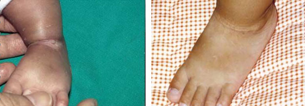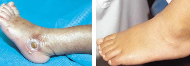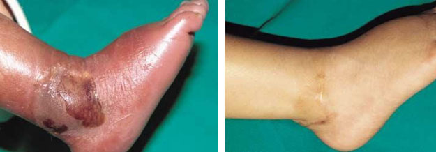 圖5.A左足輸注營養(yǎng)液液滲漏性損傷                     圖5.B應(yīng)用再生醫(yī)療技術(shù)治療2年后