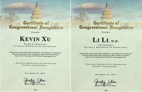 美國國會議員及洛杉磯教委委員對徐榮祥基金會的成立表示祝賀,并頒發(fā)證書。國會議員趙美心表示,目前美國正面臨醫(yī)生資源短缺、政府在醫(yī)學領域投資縮減的局面,并且在某些新技術與發(fā)明上已經(jīng)滯后,而在基金會贊助下成立的研究中心將有利于扭轉這一局面,在損傷器官領域作出突破性貢獻。趙美心認為,徐榮祥基金會的成立不僅僅是為了向徐大夫致敬,更代表著一個可以令人類世世代代更健康的契機。