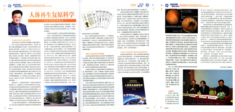 至此,人體再生復(fù)原科學(xué)已經(jīng)形成了一個完整的體系,在臨床應(yīng)用中取得了顯著的效果,在國際生命科學(xué)研究界獲得了廣泛的關(guān)注。人體再生復(fù)原科學(xué)研究不僅繼續(xù)了干細(xì)胞研究,而且在臨床實踐上完成了人體組織和器官的原位再生復(fù)原,突破了生命科學(xué)傳統(tǒng)而頑固的桎梏,為今后的世界生命科學(xué)研究開啟一個可以看到美麗遠景的窗戶。