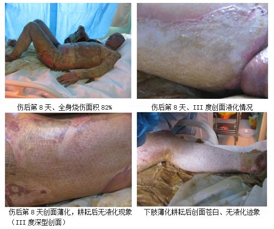 上期報導金某某,男,46歲,強堿水燒傷了全身,全身燒傷面積占80%,順利度過了休克期。傷后第8天在人體皮膚原位再生技術(shù)規(guī)范治療下,II度深型創(chuàng)面占3%已開始液化,III度淺型18%創(chuàng)面開始液化,III度深型創(chuàng)面薄化耕耘呈白色皮革樣,無液化跡象。