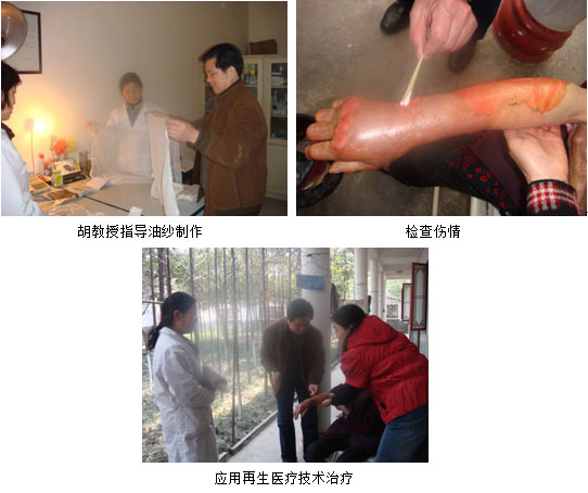 2009年2月27日,成都市敬老院一位老人不慎被燙傷,經(jīng)醫(yī)生診斷為:深Ⅱ度燒傷,15%TBSA。因敬老院醫(yī)務人員缺乏燒燙傷的救治經(jīng)驗,他們就向臨近的四川省中西醫(yī)結合學會咨詢救治方案。省學會李成林秘書長了解情況后,立即致電中國中西醫(yī)結合學會燒傷專業(yè)委員會胡教授,請其協(xié)助救治。胡教授聞訊立即和燒傷專業(yè)委員會四川辦事處工作人員帶上再生醫(yī)療藥品在秘書長的陪同下及時趕到了成都市敬老院,現(xiàn)場指導敬老院的醫(yī)務人員運用再生醫(yī)療技術和藥品對燙傷的老人進行救治,并在敬老院醫(yī)務室對醫(yī)護工作人員進行了再生醫(yī)療技術的講解和要點技術的再次示范,同時告訴醫(yī)務人員再生醫(yī)療技術還能廣泛的應用于褥瘡、皮膚潰瘍等創(chuàng)瘍性疾病,如治療過程中還需要其它技術支持可隨時聯(lián)系。敬老院的醫(yī)護人員十分感謝胡教授將這項先進的再生醫(yī)療技術教給他們,并表示要用這項技術為更多的老年人解除疾痛!