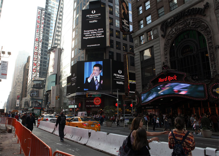昨天,路透社在第一時(shí)間報(bào)道了徐榮祥博士獲得2013年GOLDEN BIATEC 國(guó)際獎(jiǎng)的新聞,同時(shí)在紐約時(shí)代廣場(chǎng)大屏幕,刊出了徐榮祥博士的巨幅照,這是路透社第五次在紐約時(shí)代廣場(chǎng)大屏幕刊登徐榮祥博士的巨幅照片。表明了路透社對(duì)器官再生科學(xué)極大的關(guān)注。也表明了世界已經(jīng)進(jìn)入“器官再生科學(xué)”的新時(shí)代。器官再生科學(xué)時(shí)代的到來(lái),結(jié)束了上百年的生命科學(xué)的設(shè)計(jì)想象研究階段,人類(lèi)生命科學(xué)由虛擬的研究進(jìn)入到人體應(yīng)用研究階段。