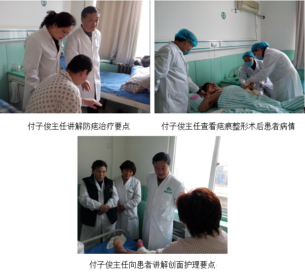 當(dāng)日下午,付主任來(lái)到醫(yī)院燒傷科病區(qū),查看燒傷患者病情,并與醫(yī)護(hù)人員座談、交流再生醫(yī)療技術(shù)的應(yīng)用心得。他著重講解了大家比較關(guān)心的整形手術(shù)和防疤治療方面的一些問(wèn)題,并在如何加強(qiáng)與患者溝通、幫助患者獲得更佳康復(fù)方面,談了自己的體會(huì)。他強(qiáng)調(diào),再生醫(yī)療技術(shù)的應(yīng)用前景很廣,目前該技術(shù)在多學(xué)科領(lǐng)域內(nèi)的臨床應(yīng)用已取得非常可喜的成績(jī),治療范圍從一般性的皮膚瘙癢、疼痛、增生、痤瘡、干裂,到皮膚的各種燒燙傷、外傷及美容整形術(shù)后、植皮后的修護(hù)和保養(yǎng),再到糖尿病足、大面積褥瘡等各種難愈性潰瘍及肛腸科、婦科、五官科等領(lǐng)域均有應(yīng)用,作為已開(kāi)展此項(xiàng)技術(shù)臨床應(yīng)用二十多年的資深專業(yè)醫(yī)護(hù)人員,大家一定要打開(kāi)思路、大膽實(shí)踐,要學(xué)會(huì)舉一反三地應(yīng)用,融會(huì)貫通地應(yīng)用,加大科研實(shí)踐力度,共同努力,為更廣泛的燒傷創(chuàng)瘍患者創(chuàng)造福祉。