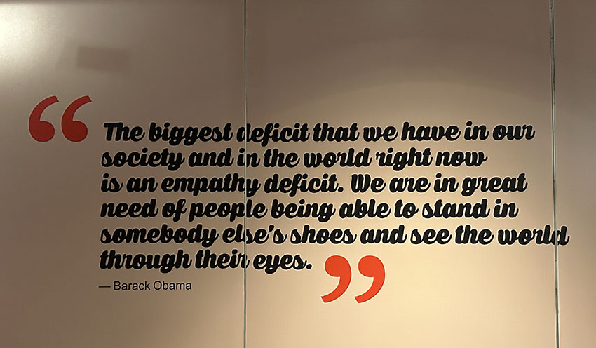 “美國(guó)燒傷協(xié)會(huì)--鞋子里的一英里”活動(dòng)是同理心博物館的一個(gè)特別項(xiàng)目,通過(guò)讓參與者穿上別人的鞋子走幾分鐘,并同時(shí)用耳機(jī)聽(tīng)一段燒傷幸存者的故事錄音,獲取同理心和洞察力。館中刻有的美國(guó)前總統(tǒng)奧巴馬曾經(jīng)說(shuō)過(guò)的——我們當(dāng)前社會(huì)最大的赤字就是同理心赤字。我們非常需要人們能夠站在別人的立場(chǎng)上,通過(guò)他們的眼睛看世界——正是此次活動(dòng)核心價(jià)值觀的體現(xiàn)。