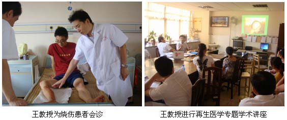 在學(xué)術(shù)講座開始前,王教授應(yīng)邀首先深入該醫(yī)院外一科(包括:燒傷整形科、神經(jīng)外科、泌尿外科)病房為一名排氣管燒傷患者會診,指導(dǎo)規(guī)范的創(chuàng)面處理方法。隨后王教授應(yīng)邀在外一科醫(yī)生辦公室進(jìn)行了“再生復(fù)原療法在燒傷及難愈性創(chuàng)面臨床規(guī)范化處理”的專題學(xué)術(shù)講座,該醫(yī)院主管副院長兼外一科主任黃永東主任醫(yī)師主持并全程聆聽了學(xué)術(shù)講座,該醫(yī)院醫(yī)務(wù)科長也參加了學(xué)術(shù)講座。